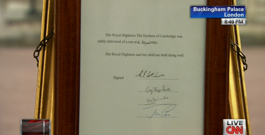 "Both my wife and I are overjoyed at the arrival of my first grandchild. It is an incredibly special moment for William and Catherine and we are so thrilled for them on the birth of their baby boy. We are eagerly looking forward to seeing the baby in the near future." (So guess that means he hasn't been to the hospital yet.)Congrats once again...
